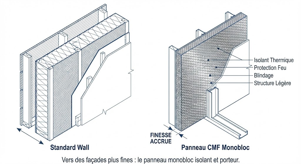 L’un des atouts majeurs pour la conception est la multifonctionnalité. Habituellement, un mur rideau métallique nécessite des couches d’isolants (laine de roche, etc.) pour traiter le thermique et l’acoustique. La structure caverneuse de la CMF piège naturellement les décibels et la chaleur. On peut imaginer des panneaux de façade monoblocs, plus fins, qui assurent à la fois le clos, le couvert, le blindage et une partie de l’isolation. Un gain de surface utile (SHON) précieux pour les promoteurs.