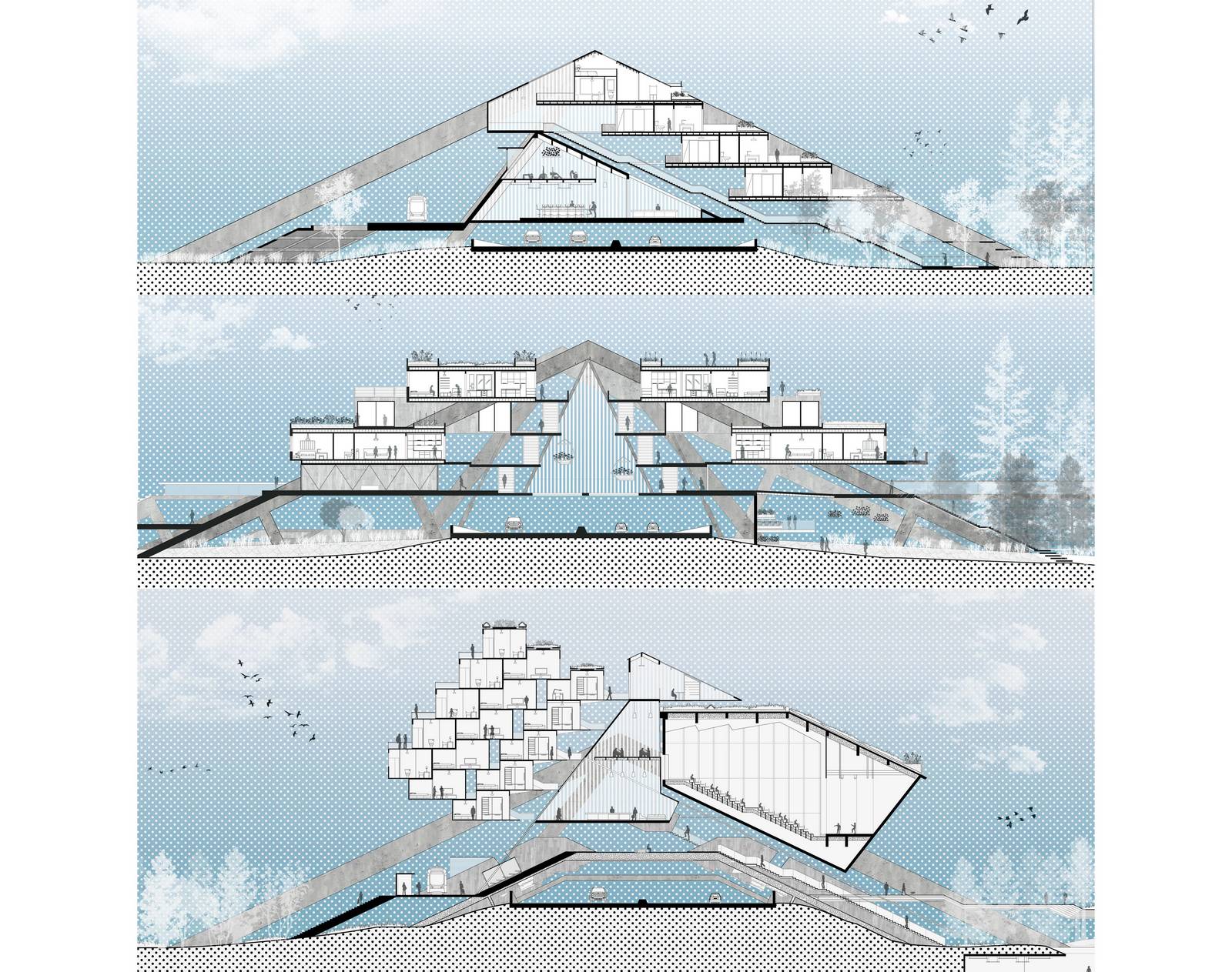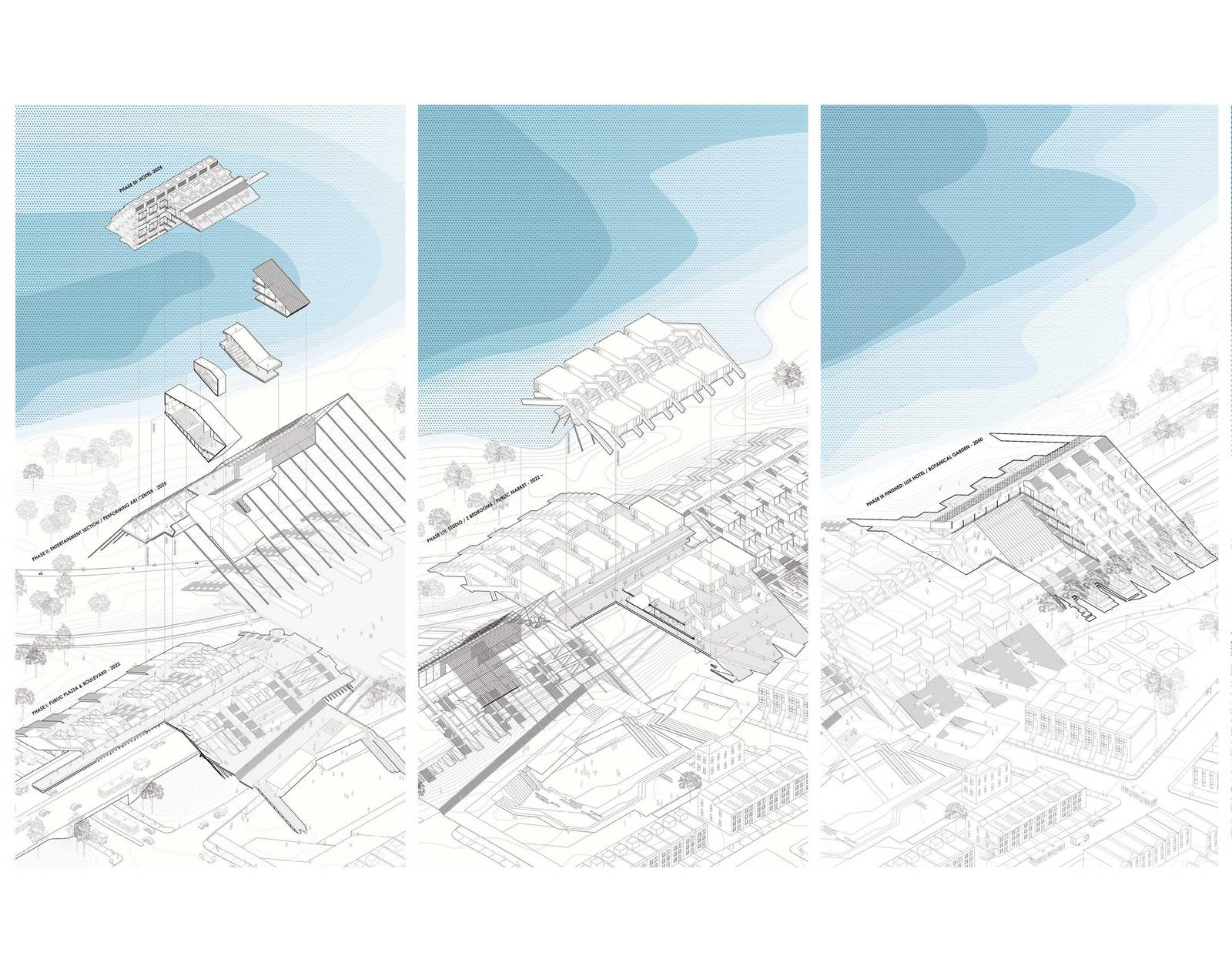Au lieu d’ancrer la ville dans des fondations rigides exposées à l’érosion et aux chocs marins, Zheng imagine une structure en boucle, une sorte de ville-pont, greffée sur les infrastructures existantes. Une ville qui s’élève pour libérer le rivage.